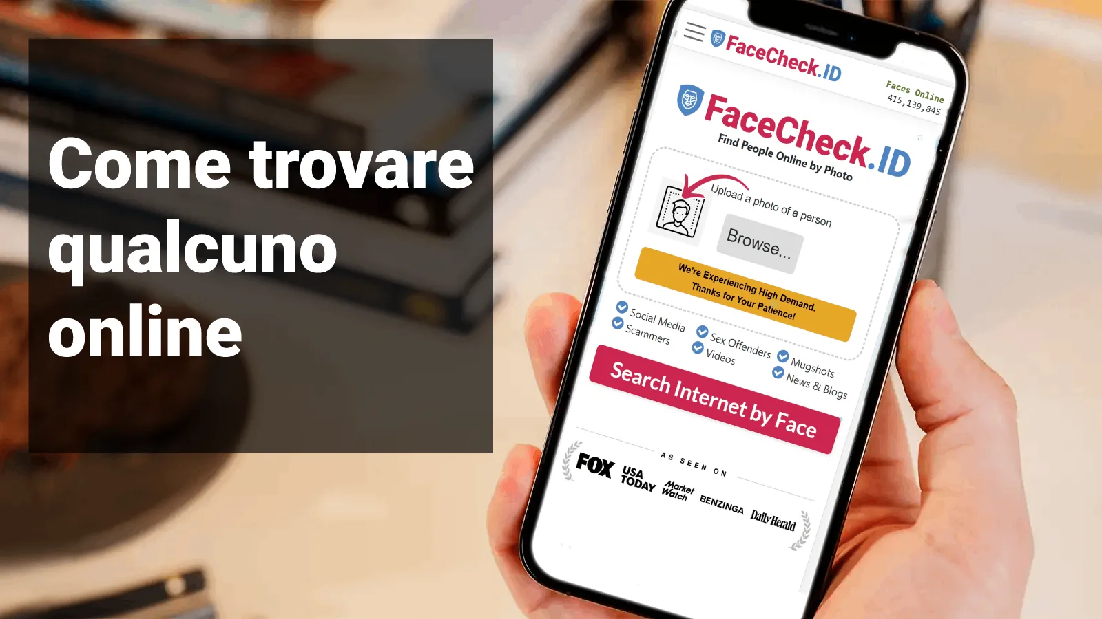 Se stai cercando una persona specifica e ne hai una foto, FaceCheck è il miglior motore di ricerca facciale per trovare qualcuno tramite foto. FaceCheck è creato appositamente per trovare persone attraverso una foto del loro volto ed è la tecnologia di riconoscimento facciale più avanzata disponibile.