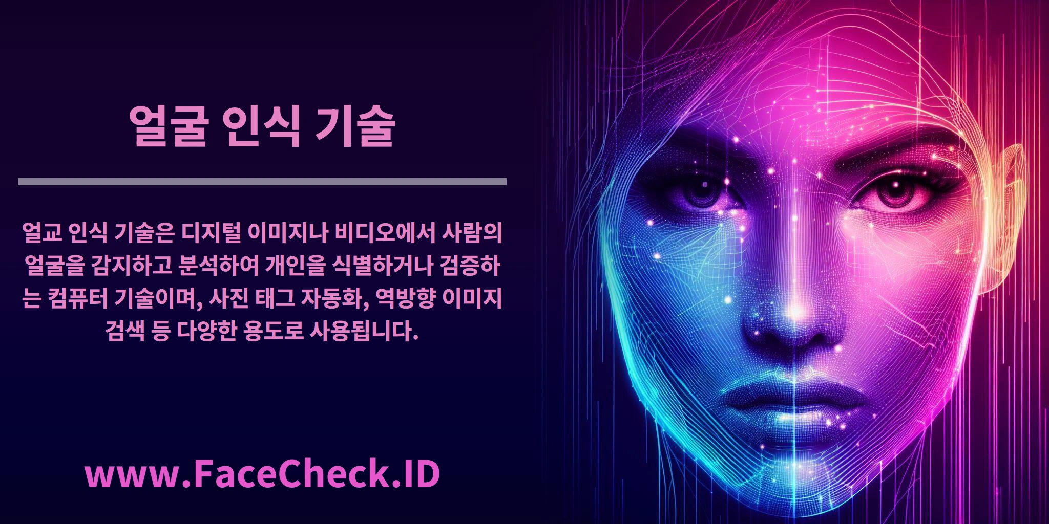 "얼굴 인식 기술"은 디지털 이미지나 비디오에서 사람의 얼굴을 감지하고 인식하는 컴퓨터 기술입니다. 이 기술은 얼굴의 물리적 특징과 형태를 분석하여 개인을 식별하거나 검증할 수 있습니다. 또한, 얼굴 인식 기술은 소셜 미디어 플랫폼에서 사용자가 사진을 업로드하면 자동으로 친구들의 얼굴을 태그하는 기능을 제공하거나, 역방향 이미지 검색에서 이미지의 유사성을 찾는 등 다양한 용도로 사용됩니다.